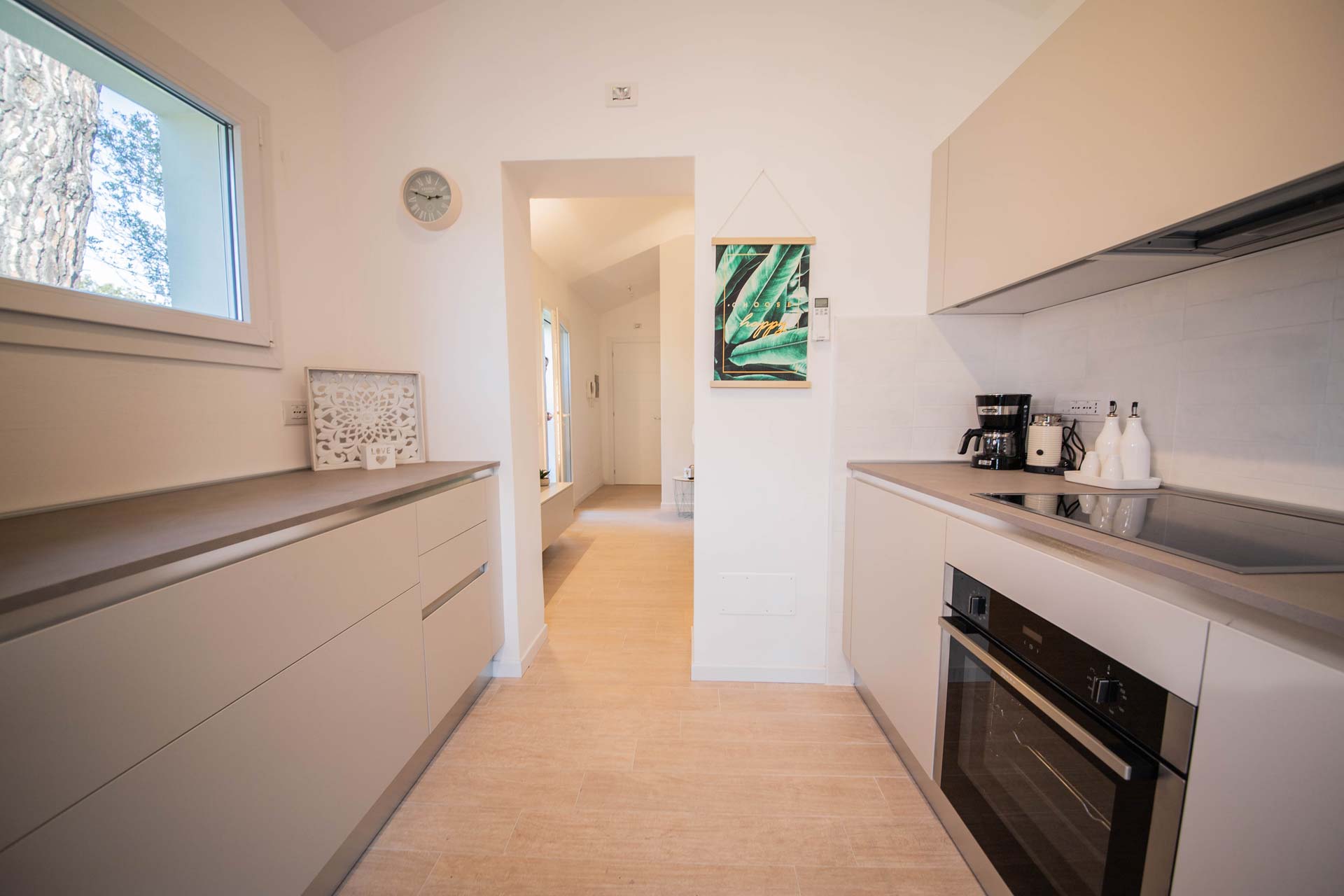 The living area includes a small room with a sofa bed where a child could sleep, a closet with a small wardrobe, a fully equipped Open Space Kitchen with a washing machine and a dishwasher, that has direct access to the outdoor terrace with pergola. All rooms come with mosquito nets.
